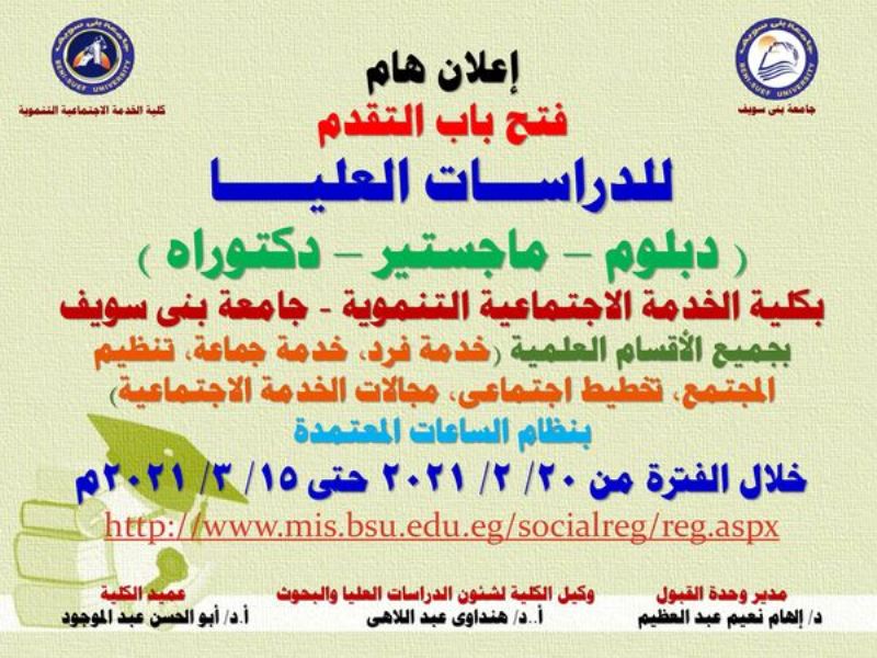 فتح باب التقدم للدراســـات العليـــــا ( دبلوم – ماجستير – دكتوراه ) بكلية الخدمة الاجتماعية التنموية - جامعة بنى سويف بجميع الأقسام العلمية (خدمة فرد، خدمة جماعة، تنظيم المجتمع، تخطيط اجتماعى، مجالات الخدمة الاجتماعية) بنظام الساعات المعتمدة