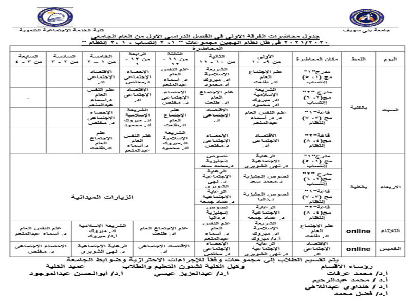 Zeitplan der Vorlesungen der ersten Klasse für das erste Semester des akademischen Jahres 2020/2021 unter Hybridsystem